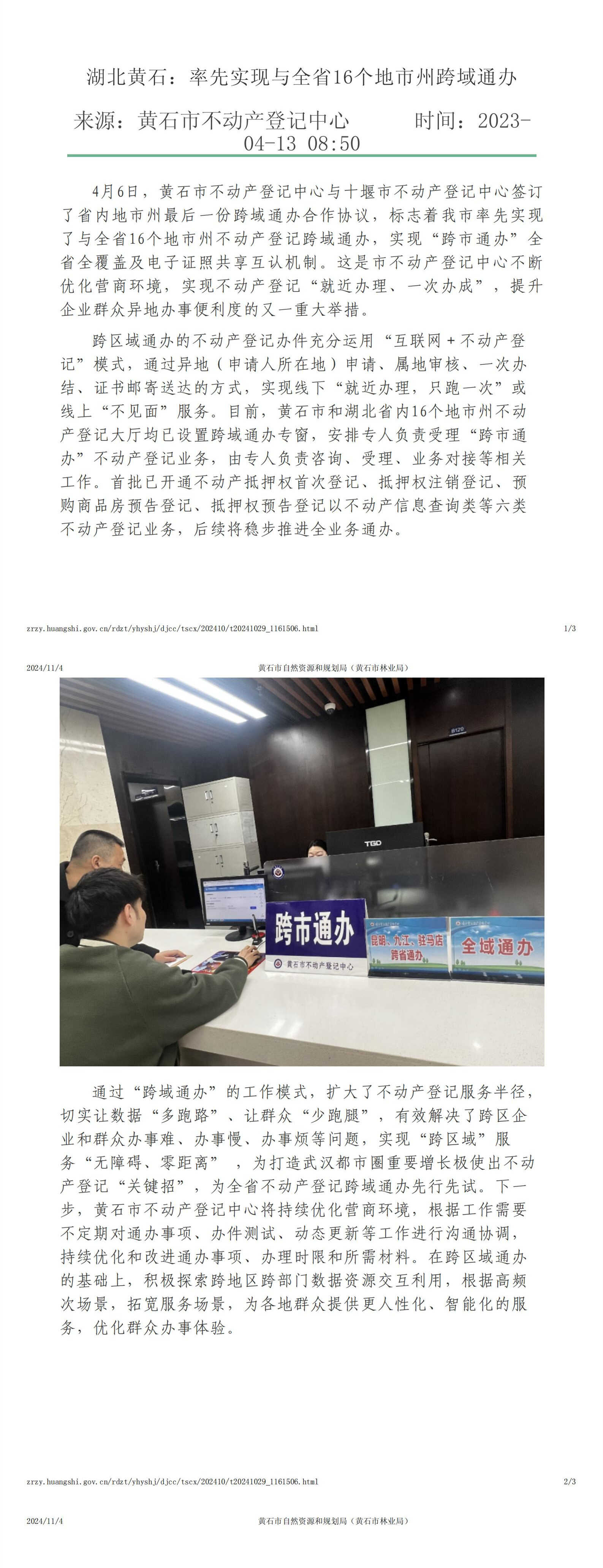 湖北黄石:率先实现与全省16个地市州跨域通办