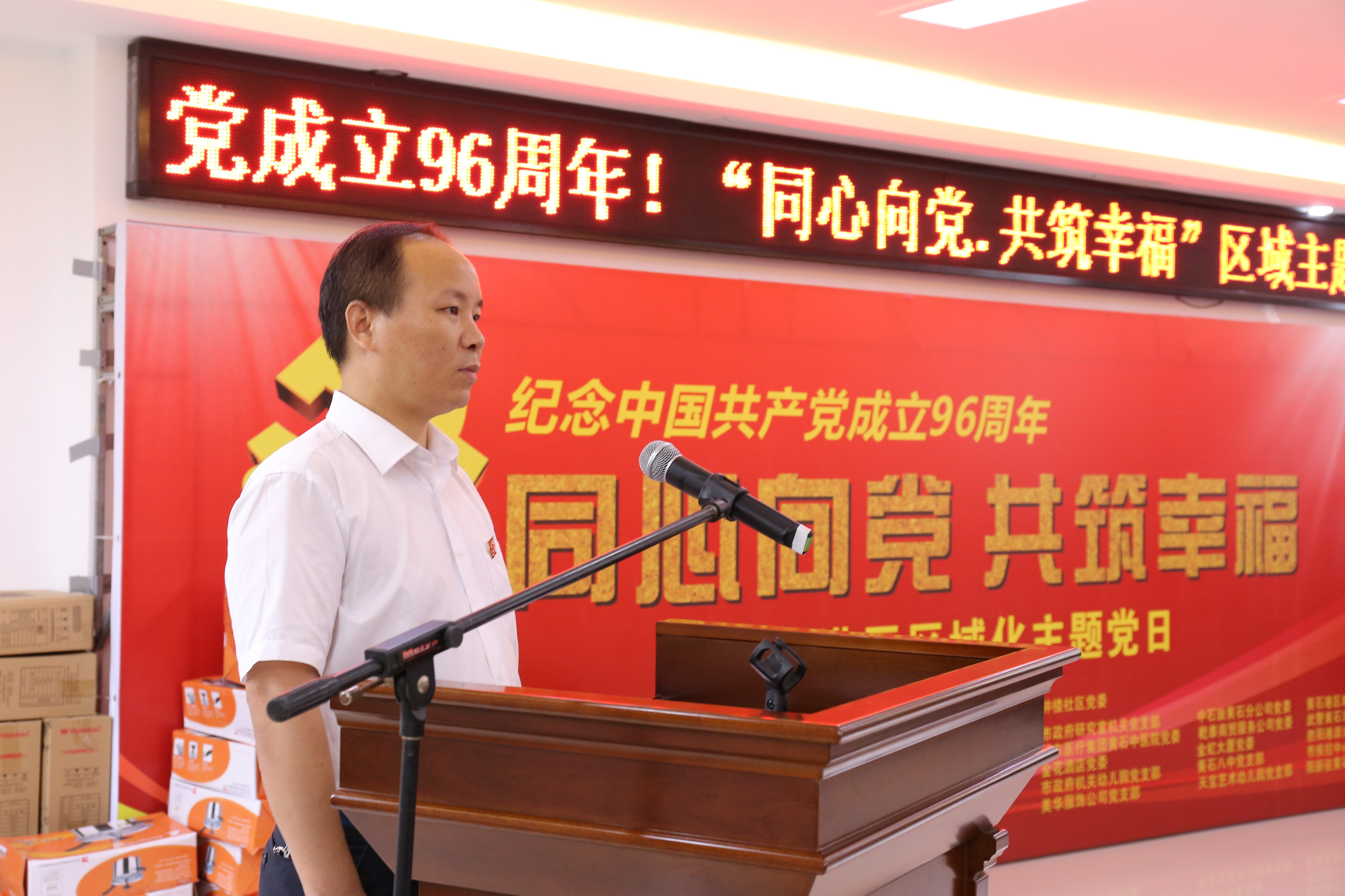 71日上午9时,钟楼社区党委在社区三楼会议室隆重举行庆祝中国共产党成立96周年纪念活动,联合市、区、街道包保部门与辖区共建单位党组织集中开展“同心向党﹒共筑幸福”区域化主题党日活动。市政府研究室副主任石功成、中石油黄石分公司副总经理韩征龙、黄石港区城管局副局长胡立强、胜阳港街道办事处副主任董艳东带领机关在职党员参加社区活动,辖区黄石中医院、乾泰商贸服务有限公司、市政府机关幼儿园、黄石八中、武警黄石消防路中队等13家共建单位在职党员及社区直管党员、入党积极分子等190余人参加了活动。