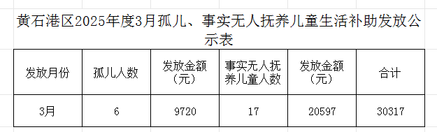 黄石港区2025年度3月孤儿、事实无人抚养儿童生活补助发放公示