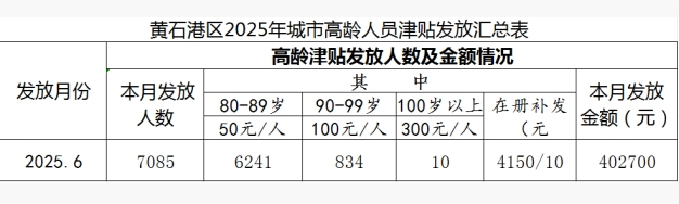 黄石港区2025年6月高龄津贴发放公示