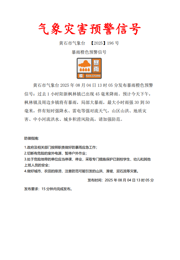 2025年08月04日13时05分发布暴雨橙色预警信号