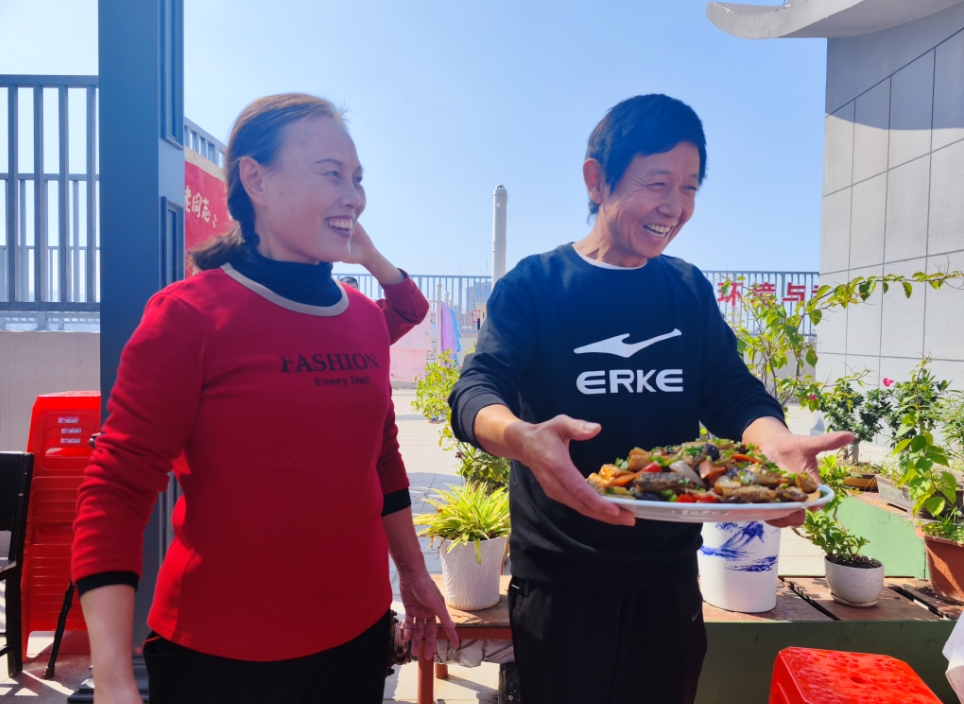 “正是吃螃蟹的季节,今天做了油焖螃蟹,还有个基围虾,端上来大家一起享用。”11楼87岁居民刘秀英与家人端着菜肴来到楼顶。