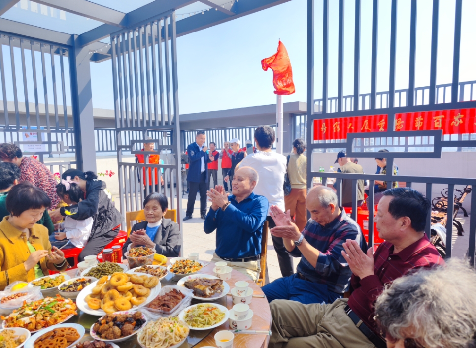 一生邻里,百味家宴。23日中午,黄石港区红旗桥社区鼎鑫大厦楼顶的“空中花园”特别热闹,这里正在举行庆祝重阳节百家宴活动。