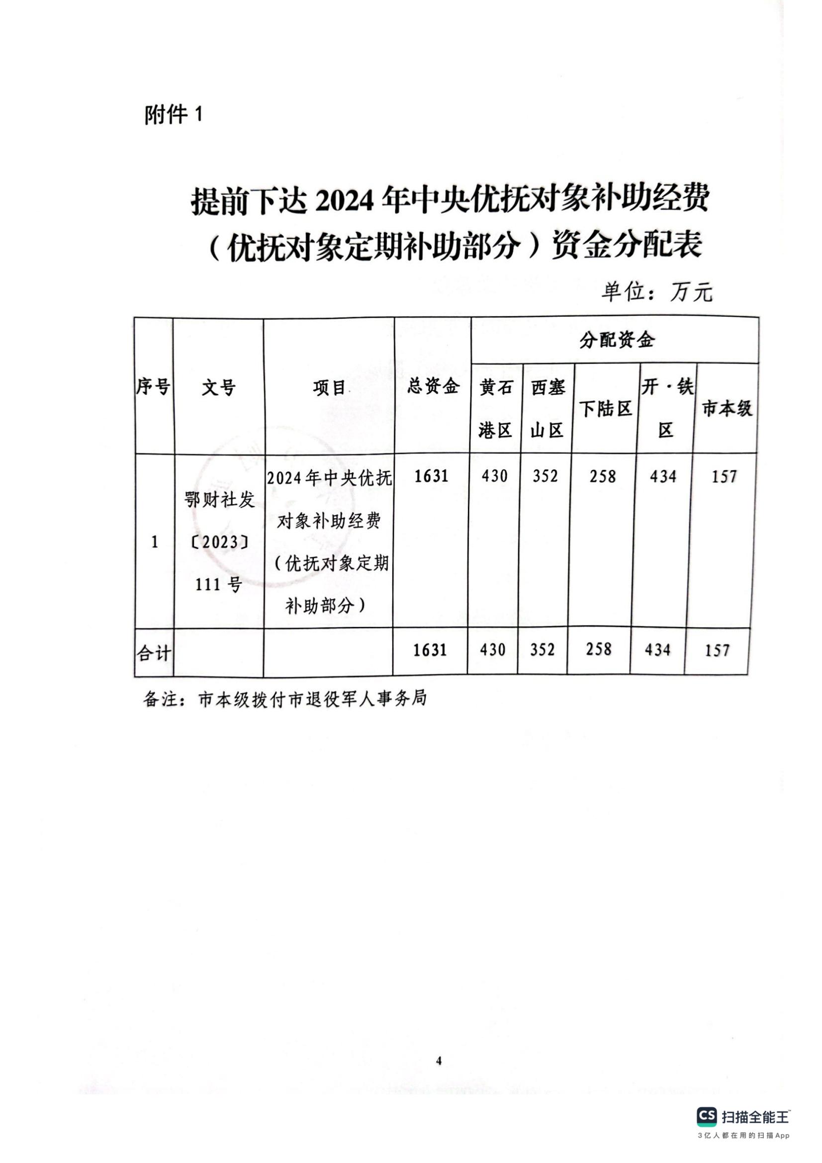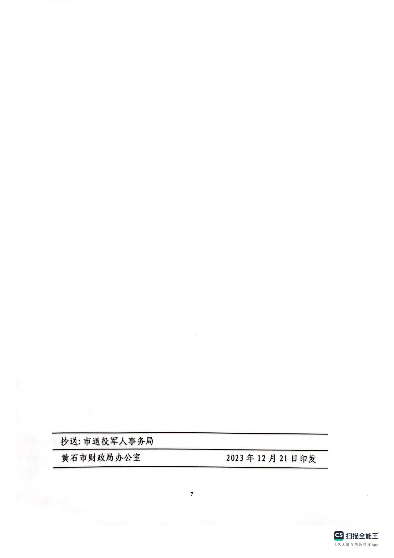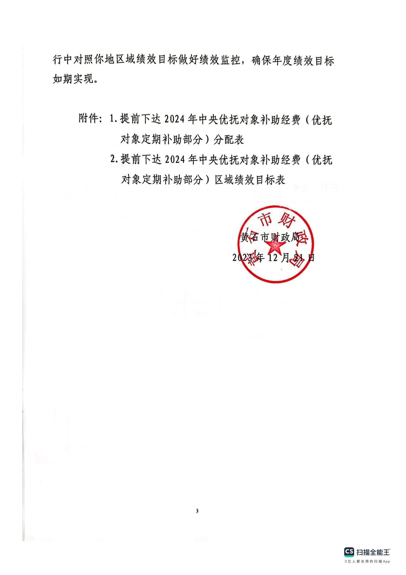 黄财社发【2023】309号黄石市财政局关于提前下达2024年中央优抚对象补助经费优抚对象定期补助部分的通知
