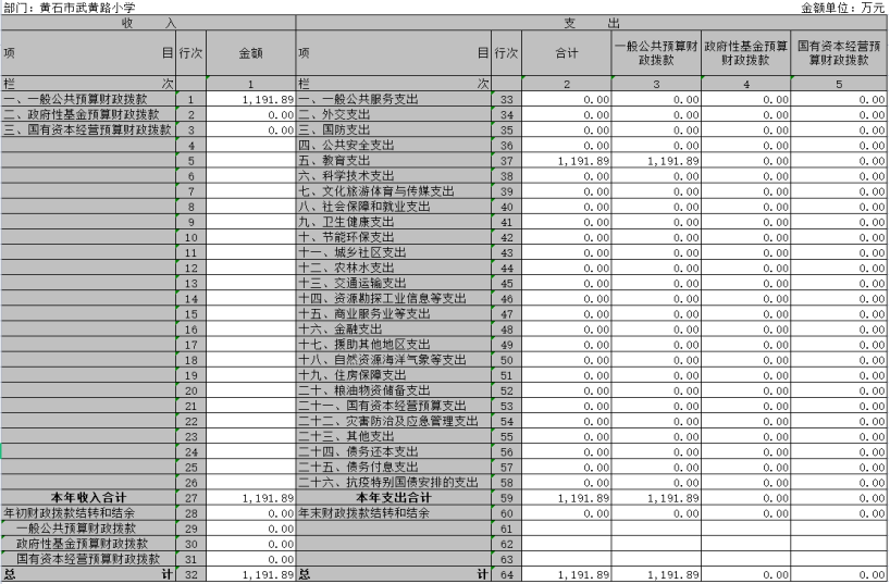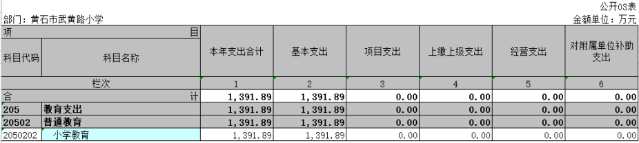 - 教育支出(类)普通教育(款)小学教育(项):年初预算为 499.45 万元,支出决算为 1191.89 万元,完成年初预算的 238.64 %,主要用于学校日常运行支出及武黄路小学改扩建(二期)动工。