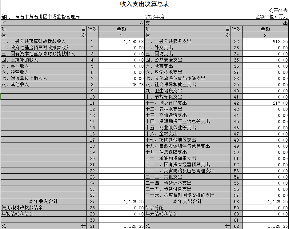 2023年度收、支总计均为1129.35万元。与2022年度1344.84相比,收、支总计各减少215.49万元,下降16.02%,主要原因是本年食品监管专项经费减少。