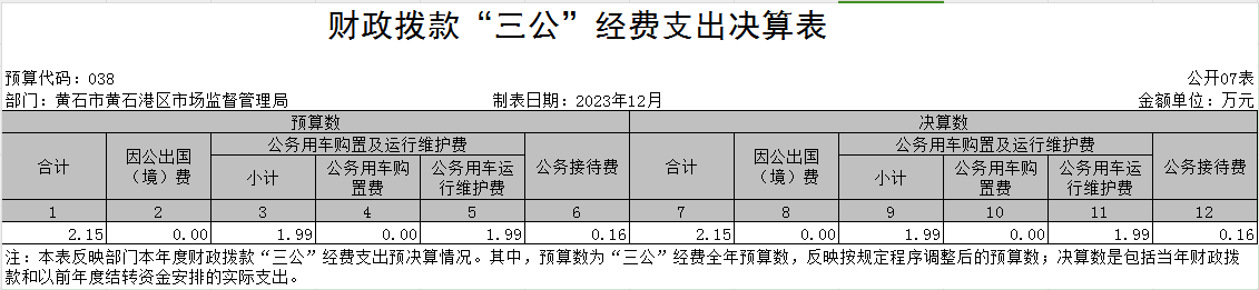 2023年度“三公”经费财政拨款支出预算为 1.75 万元,支出决算为2.15万元,完成预算的100%。较上年1.34万元增加0.81万元,增长60.45 %。决算数大于全年初算数的主要原因:本年公务车运行费用(执法车辆)1.99万元,保险费用及汽油费增长。本年公务接待0.16万元;同比上年减少47.49%;本年公务接待批次1批次,接待人数共计12人,均有相关审批附件。