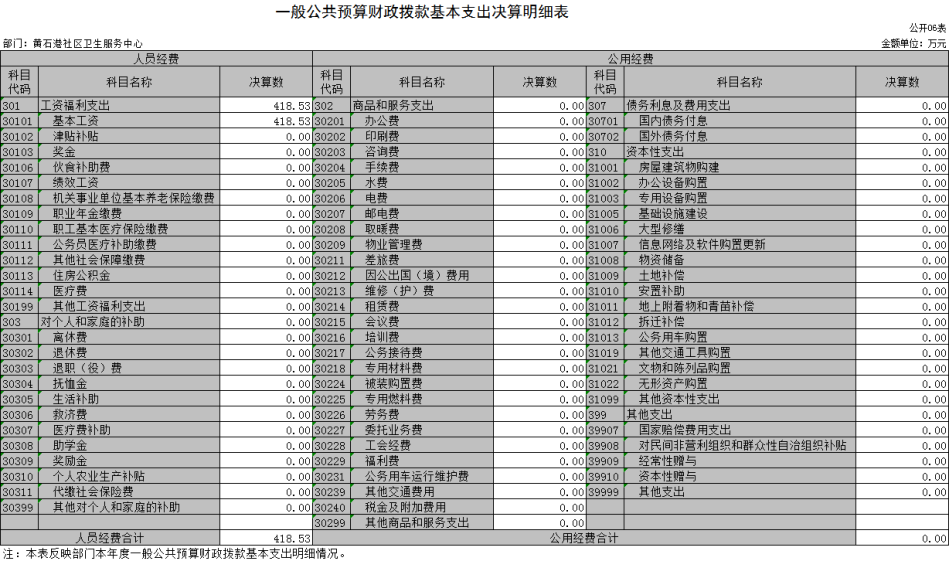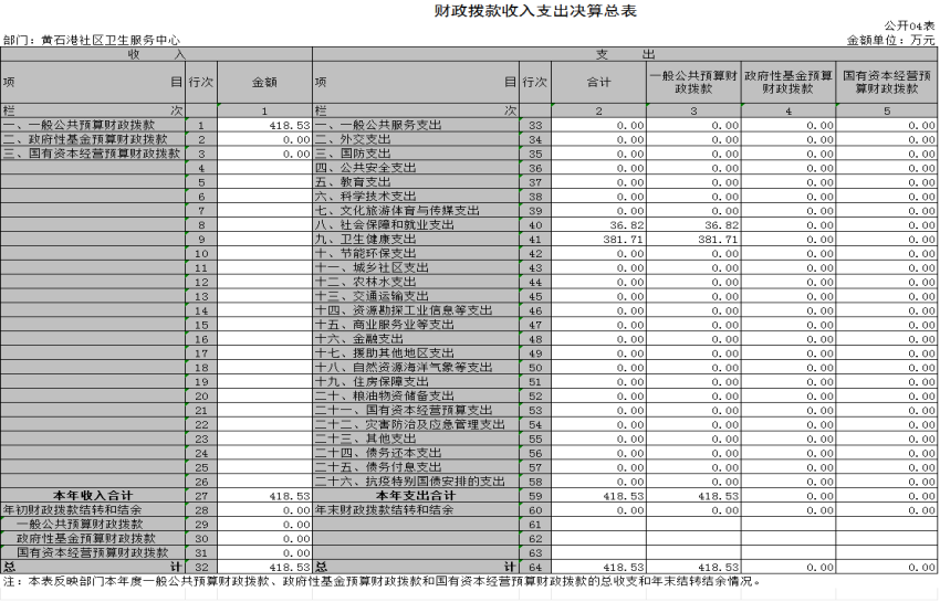 一、一般公共预算财政拨款收入 | 1 | 418.53 | 一、一般公共服务支出 | 32 | 0.00 |