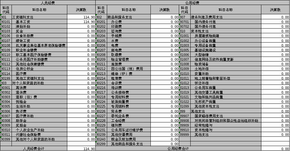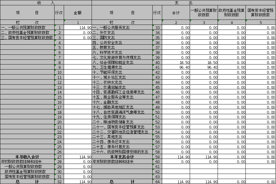 一、一般公共预算财政拨款收入 | 1 | 114.90 | 一、一般公共服务支出 | 32 | 0.00 |