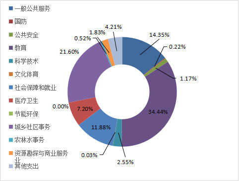 在2016年一般公共预算支出总量中,教育类和城乡社区类支出占比最大,分别为34.44%、21.6%,社会性支出稳步增长,财政资金使用效益进一步提高。财政部门积极落实财政政策导向,加强财政支持经济改革的力度,更多的财力用于社会发展和卫生文明建设,大力调整财政支出结构,社会性支出稳步增长,促进了社会全面协调和发展。