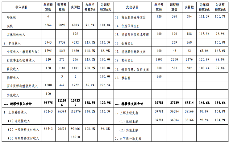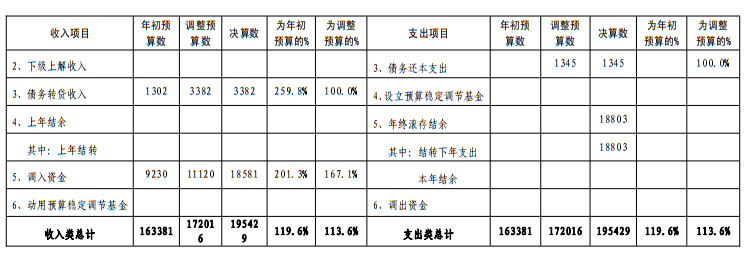 2020 年一般公共预算收入完成 61090 万元,债务转贷收入3382 万元,加上上级补助收入 112376 万元,调入资金 18581 万元,收入类合计 195429 万元;2020 年完成一般公共预算支出137115 万元,上解上级支出 38166 万元,债务还本支出 1345 万元,结转下年专项支出 18803 万元,当年支出类合计 195429 万元,收支相抵,当年预算收支平衡。