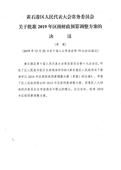 黄石港区人民代表大会常务委员会关于批准2019年区级财政预算调整方案的决议(草案)