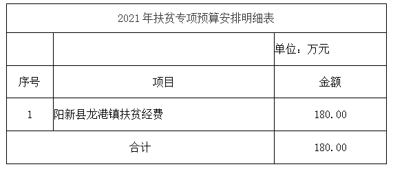 根据《财政部关于全面加强脱贫攻坚期内各级各类扶贫资金管理的意见》(财办〔2018〕24号)等文件精神,打好精准脱贫攻坚战,2021年黄石港区安排财政扶贫资金180万元,具体如下: