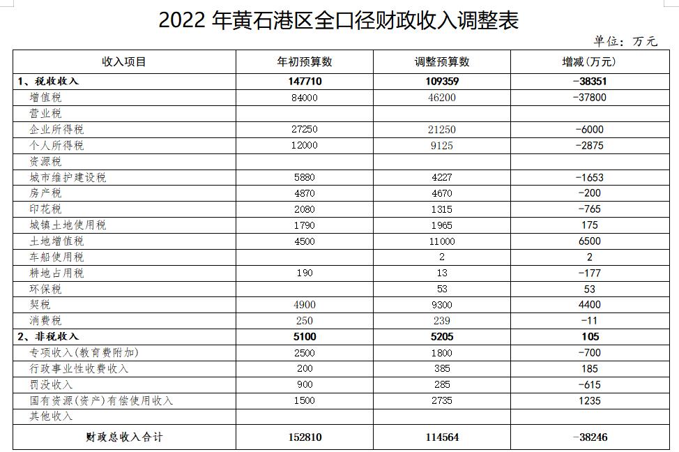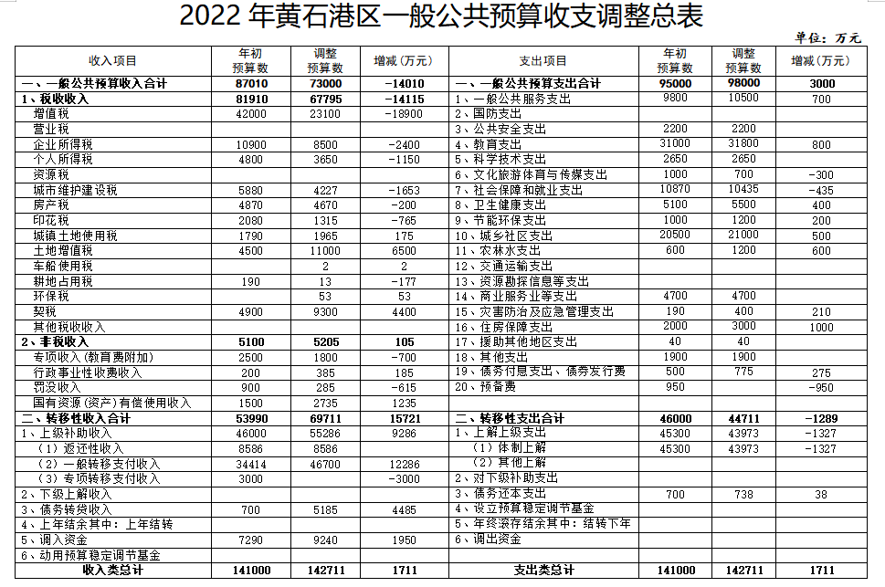 根据以上情况,2022年黄石港区一般公共预算收入较年初预算减少14010万元,转移性收入增加15721万元,收入类增加1711万元;2022年一般公共预算支出较年初预算增加3000万元,转移性支出减少1289万元,支出类增加1711万元,收支相抵,预算收支平衡。调整后,一般公共预算收入73000万元,加上上级补助55286万元、债务转贷收入5185万元、调入资金9240万元,减去体制上解支出43973万元、债务还本支出738万元,安排一般公共预算支出98000万元。