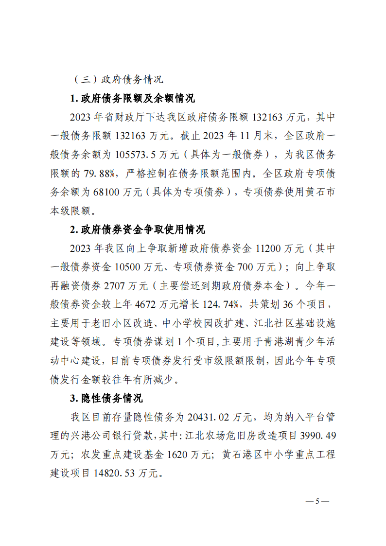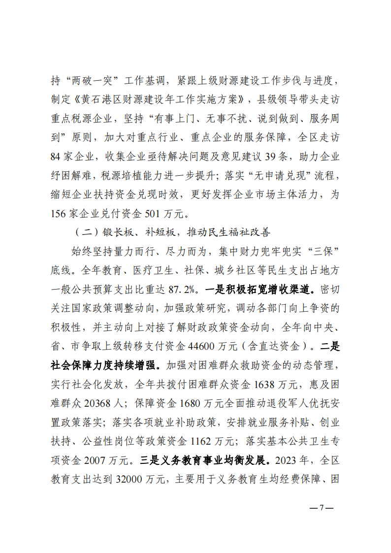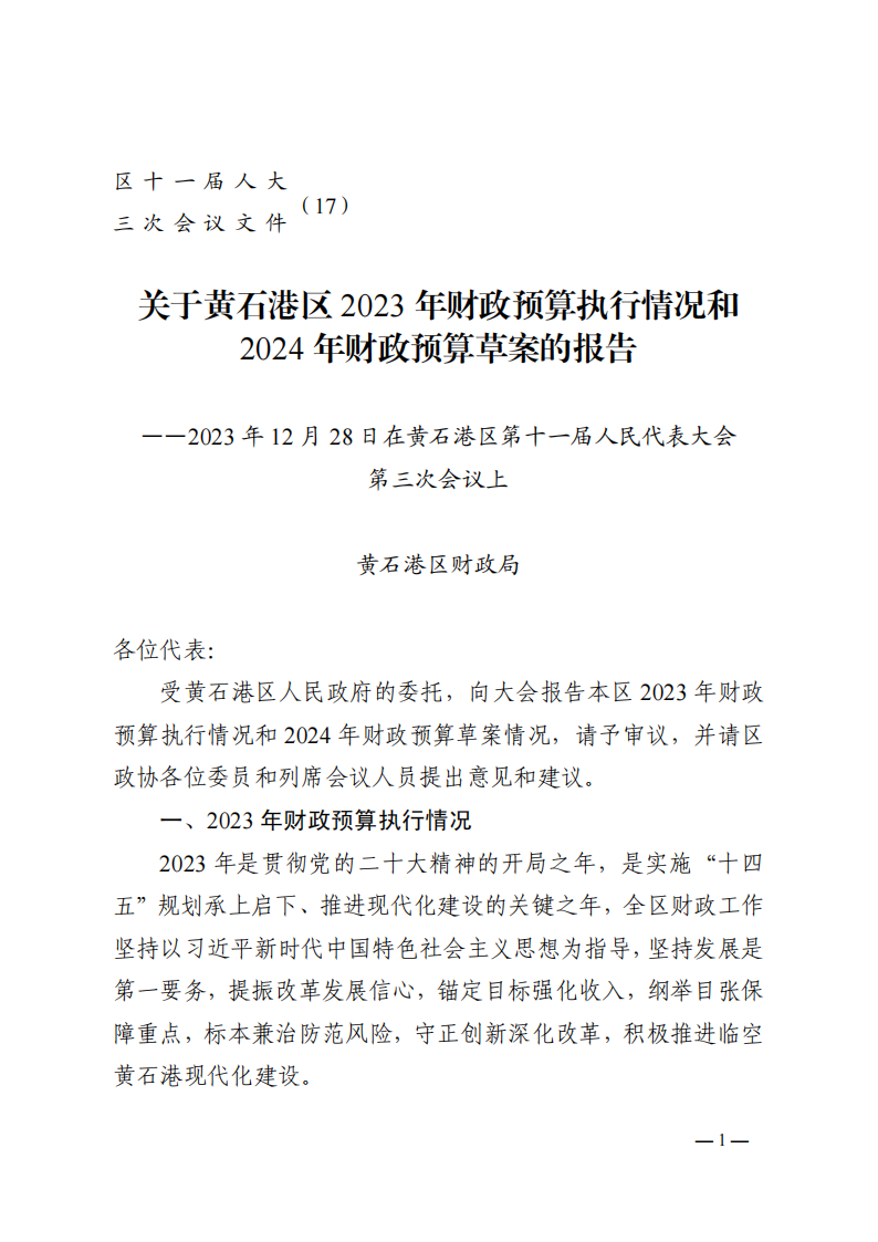 关于黄石港区2023年财政预算执行情况和2024年财政预算草案的报告