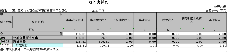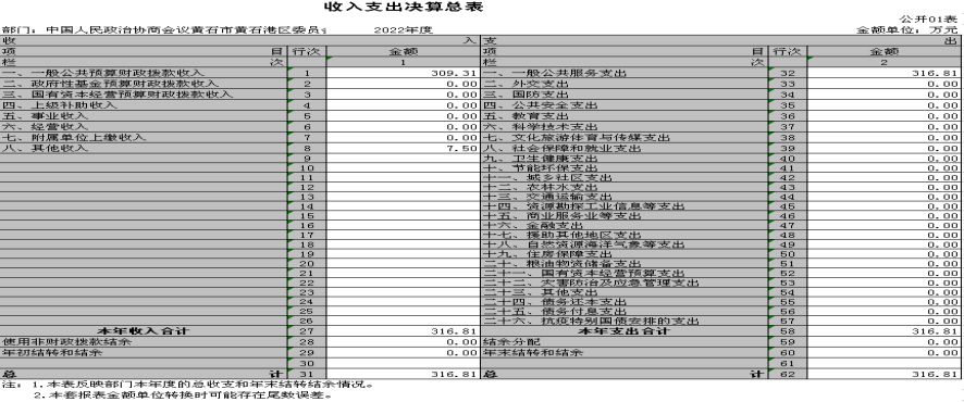 2022年度收、支总计均为316.81万元。与2021年度相比,收、支总计各减少67.04万元,下降17.47%,主要原因是去年有召开区政协八届五次会议事务