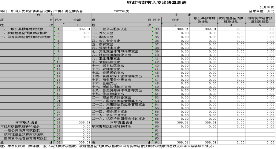 2022年度财政拨款收、支总计均为309.31万元。与2021年度相比,财政拨款收、支总计各减少72.54万元,下降19.00%。主要原因是去年有召开区政协八届五次会议事务。