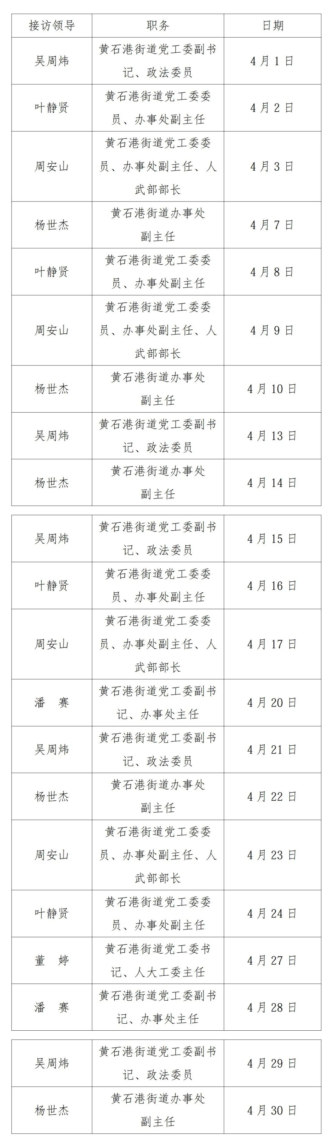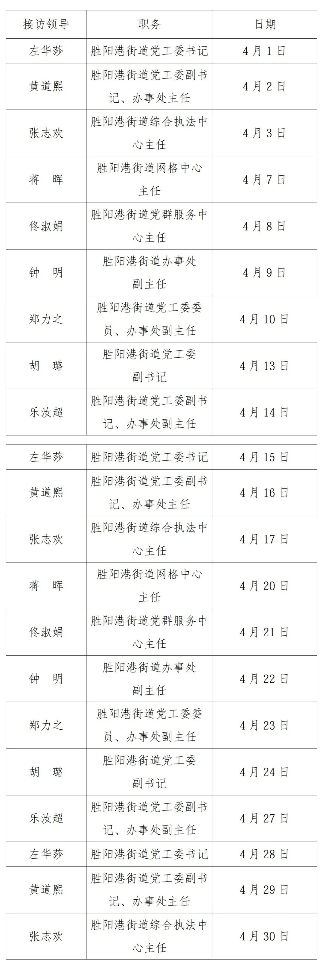 为深入推进平安建设,提升基层社会治理现代化水平,充分发挥综治中心及时为群众解决难办问题的枢纽作用,根据工作安排,现将4月区、街道两级领导、“七长”入驻综治中心接访有关事项公告如下: