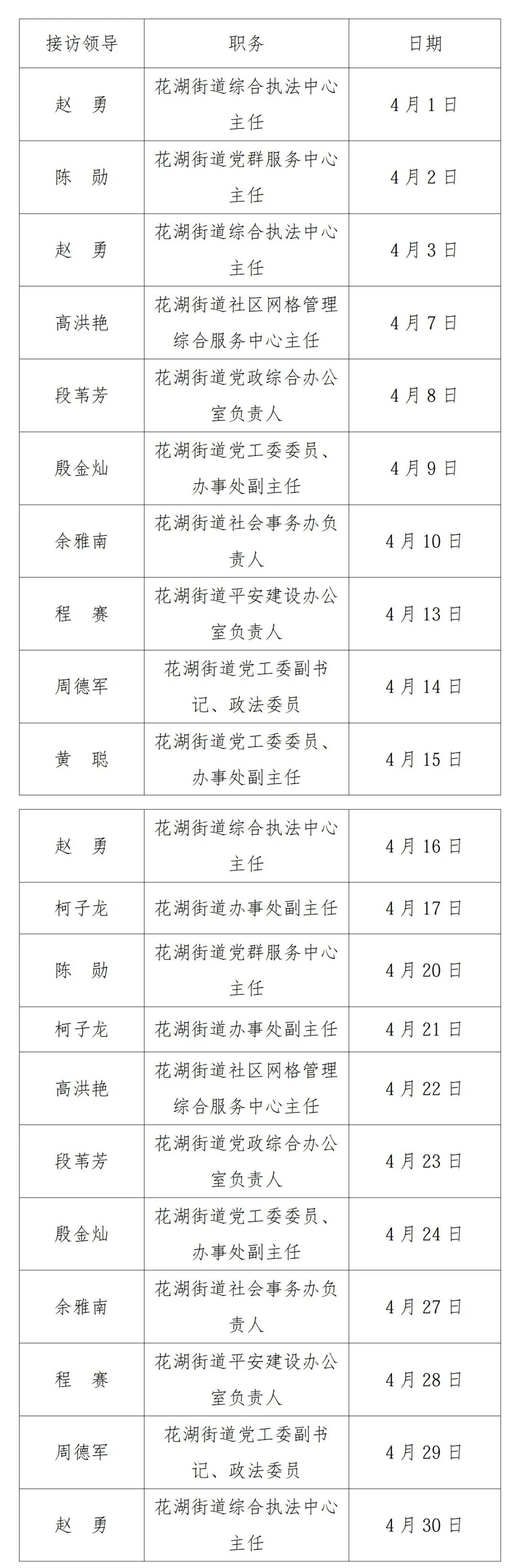 为深入推进平安建设,提升基层社会治理现代化水平,充分发挥综治中心及时为群众解决难办问题的枢纽作用,根据工作安排,现将4月区、街道两级领导、“七长”入驻综治中心接访有关事项公告如下: