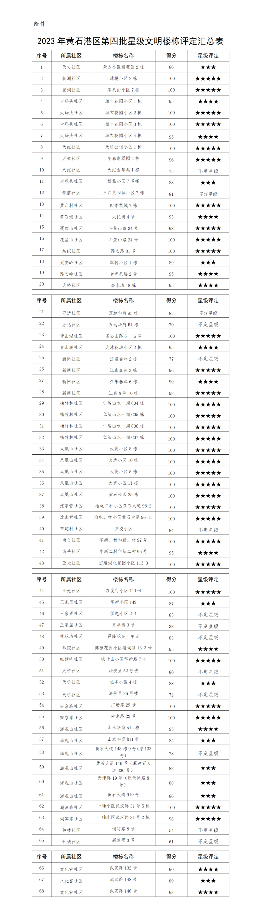 根据《关于印发<黄石市星级文明小区(楼栋)评选工作实施方案>的通知》(黄创文指办〔2023〕16号)文件精神,经各街道逐级推荐、实地检查和随机抽查等程序,拟确定2023年黄石港区星级文明楼栋(第四批)名单。现将名单予以公示,接受广大群众监督,公示期为2023年9月2日至9月4日。如有异议,请以电话、书面形式向区委文明办、区创文办反映,联系人:丁红兵,联系电话:0714-6588977,电子邮箱:544699544@qq.com。