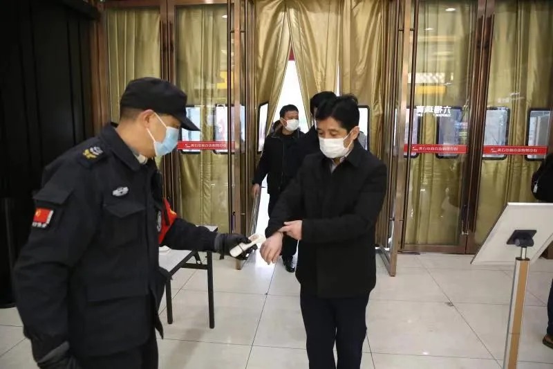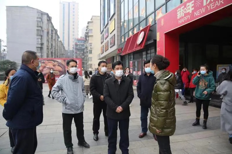 在沃尔玛商圈,严荣勇仔细观察商场工作人员是否严格执行入口测温、劝导戴口罩、“一米线”等防疫措施,督促商超负责人加强巡逻力量,及时劝导,发现发热人员及时报告并对接医疗机构就诊。
