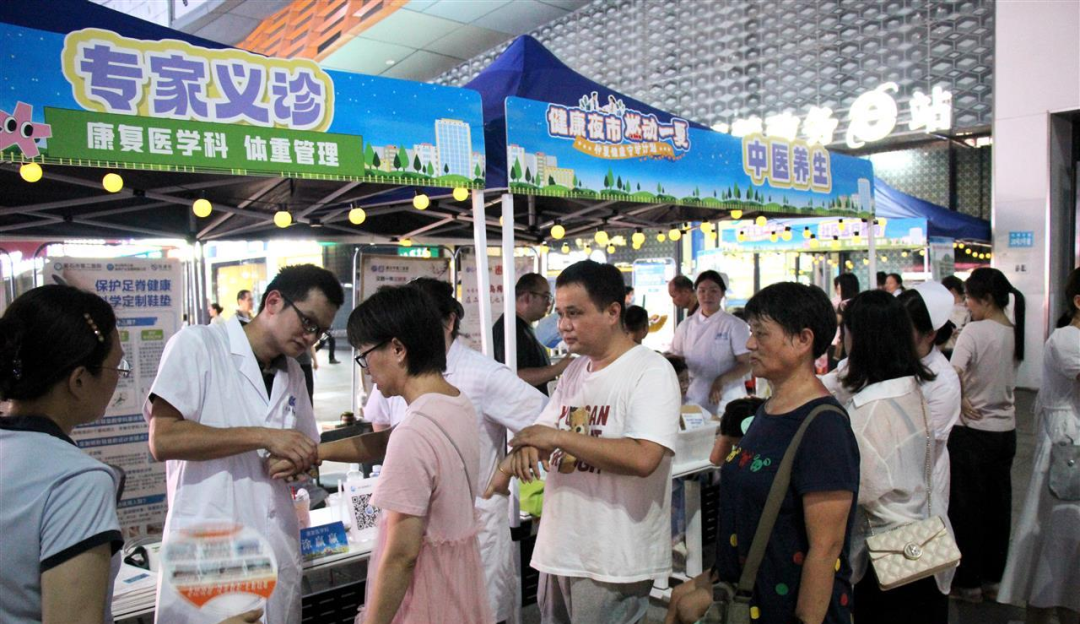 当日,由市城发集团组织,鄂东医养集团(黄石市第二医院)联合区卫健局等单位共同举办的“健康夜市”活动拉开帷幕,免费健康筛查、专家义诊、中医养生、健康养老、急救课堂、生育支持服务、家庭医生签约服务、上门护理服务等摊位依次排开,同时还有公交集团、水务集团、文旅集团、商管集团等摆开摊位,吸引许多市民排队体验咨询。