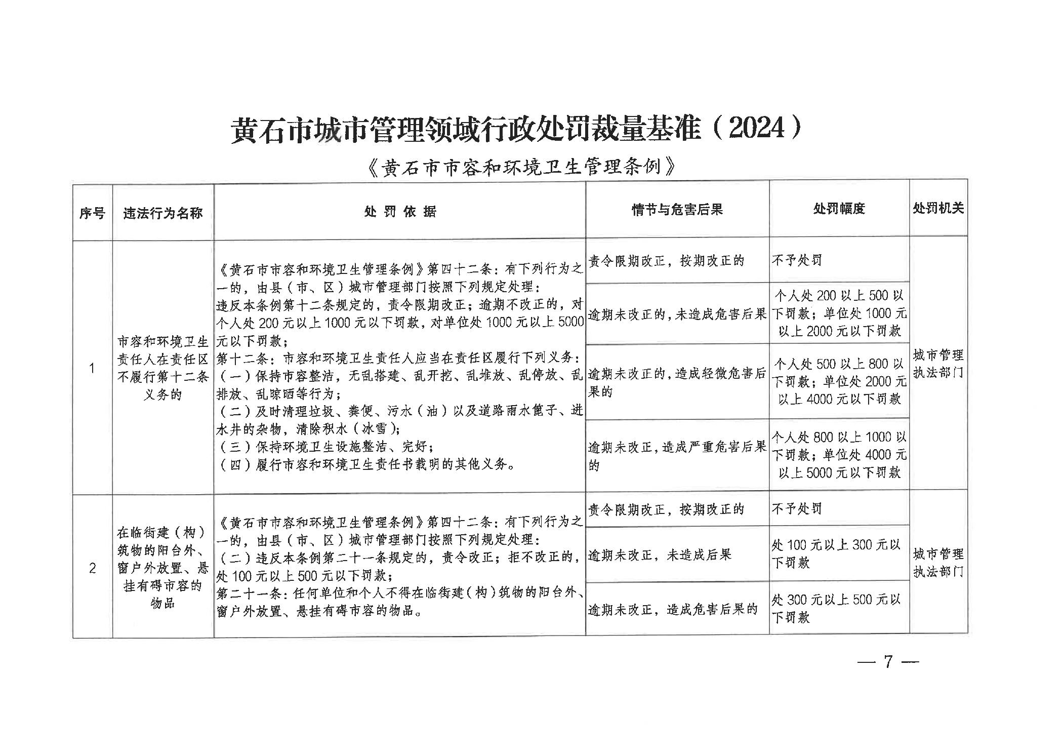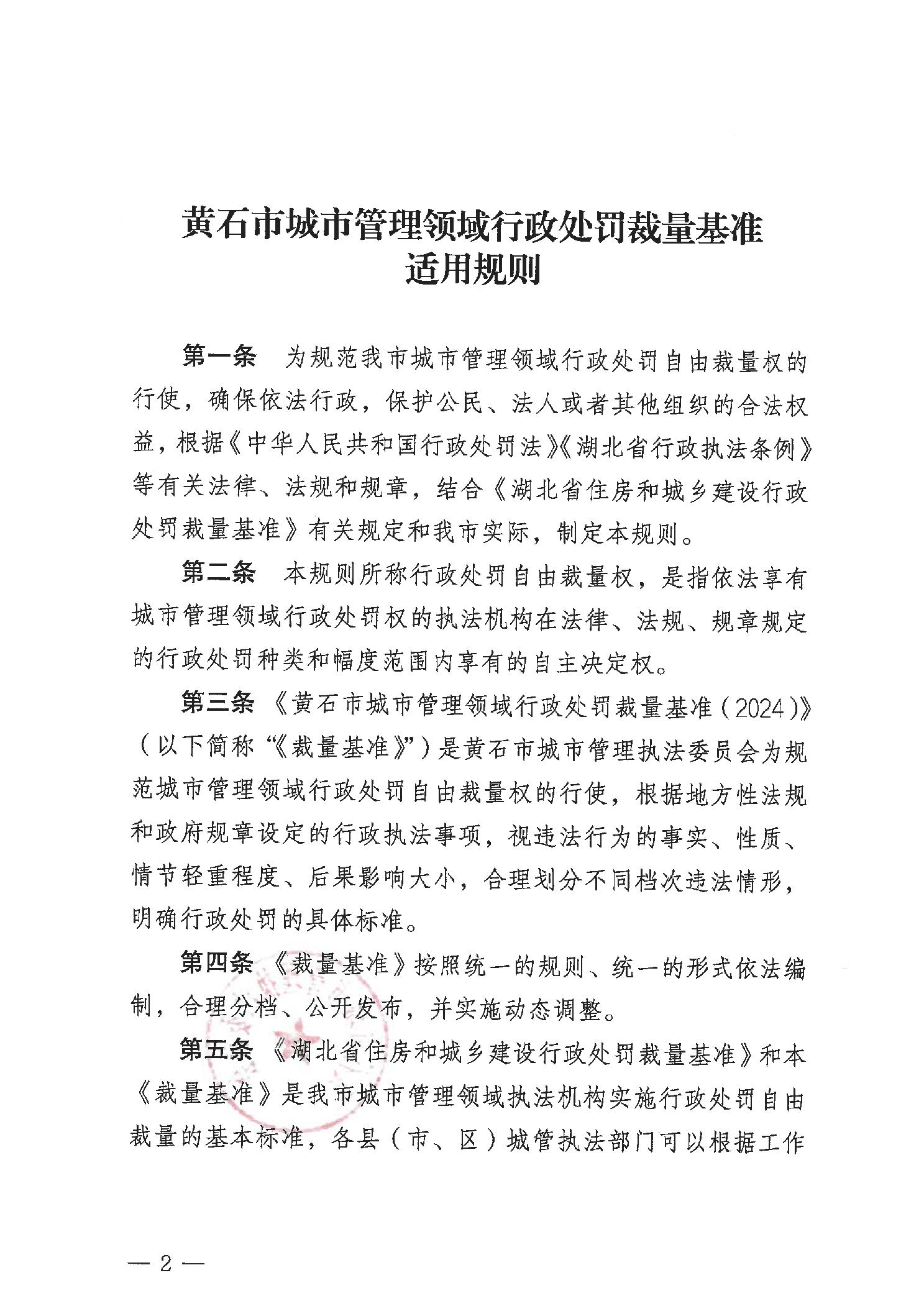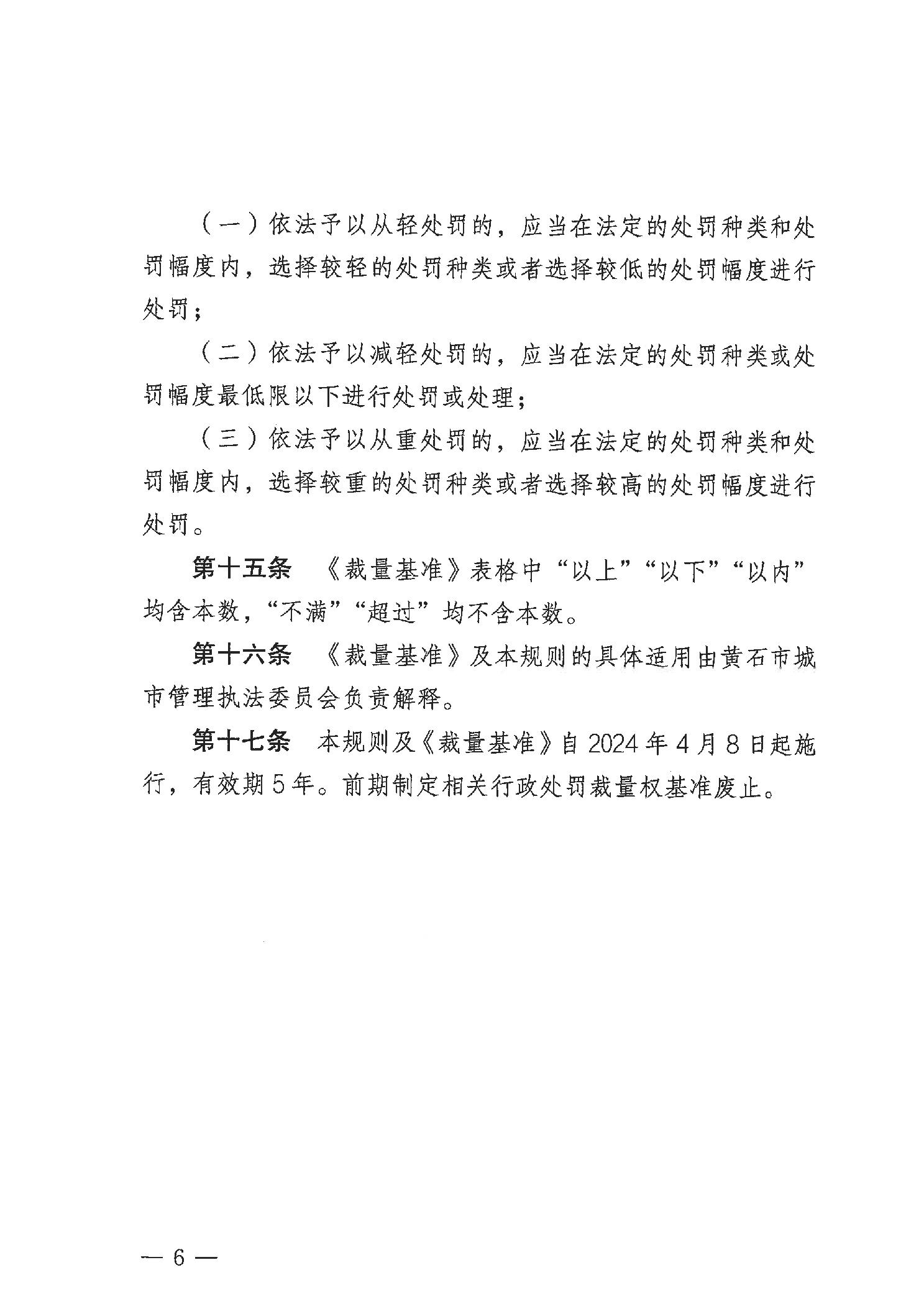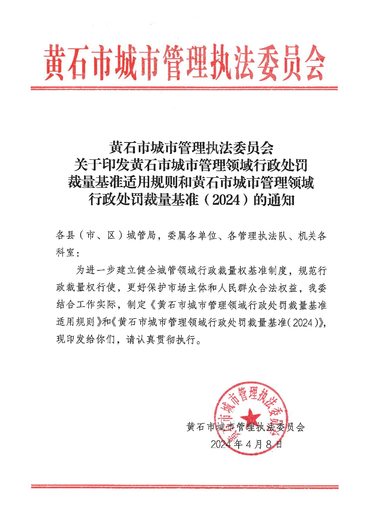 黄石市城市管理执法委员会关于印发黄石市城市管理领域行政处罚裁量基准适用规则和黄石市城市管理领域行政处罚裁量基准(2024)的通知