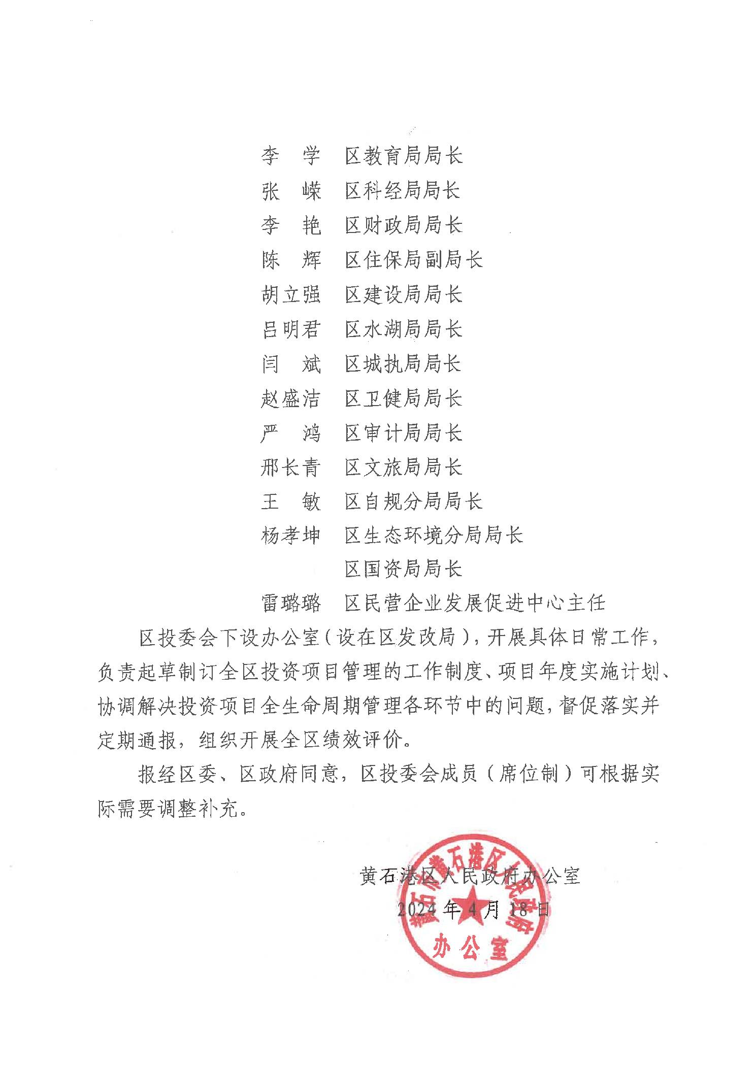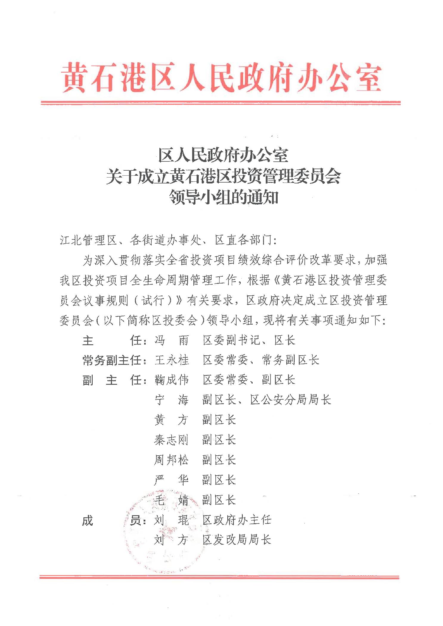 区人民政府办公室关于成立黄石港区投资管理委员会领导小组的通知