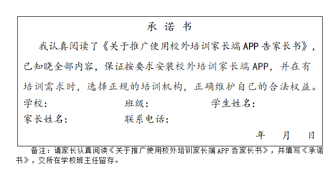 请各校于5月25日前,通过班主任向每一位家长发放《关于学生参加校外培训、校外托管的告家长书》,同时做好《承诺书》的收回保存和校外培训家长端APP的安装使用落实工作。