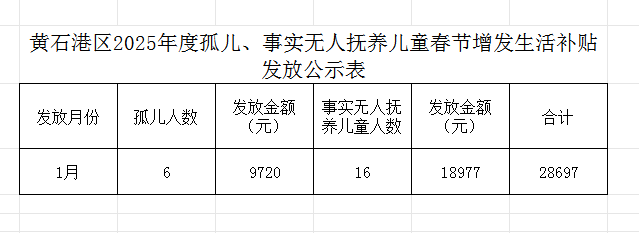 黄石港区2025年度孤儿、事实无人抚养儿童春节增发生活补贴发放公示表