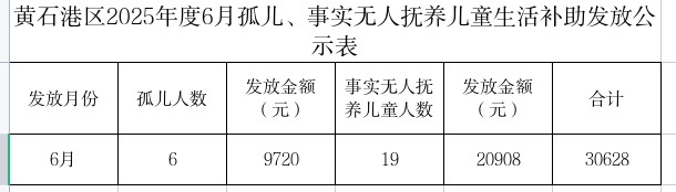 黄石港区2025年度6月孤儿、事实无人抚养儿童生活补助发放公示表
