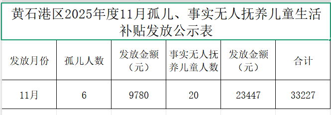 黄石港区2025年度11月孤儿、事实无人抚养儿童生活补助发放