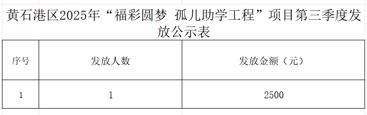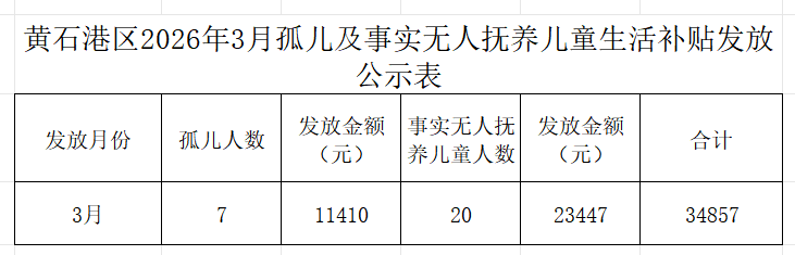 黄石港区2026年度3月孤儿及事实无人抚养儿童生活补贴暨2025年“福彩圆梦 孤儿助学工程”项目第三季度发放公示表