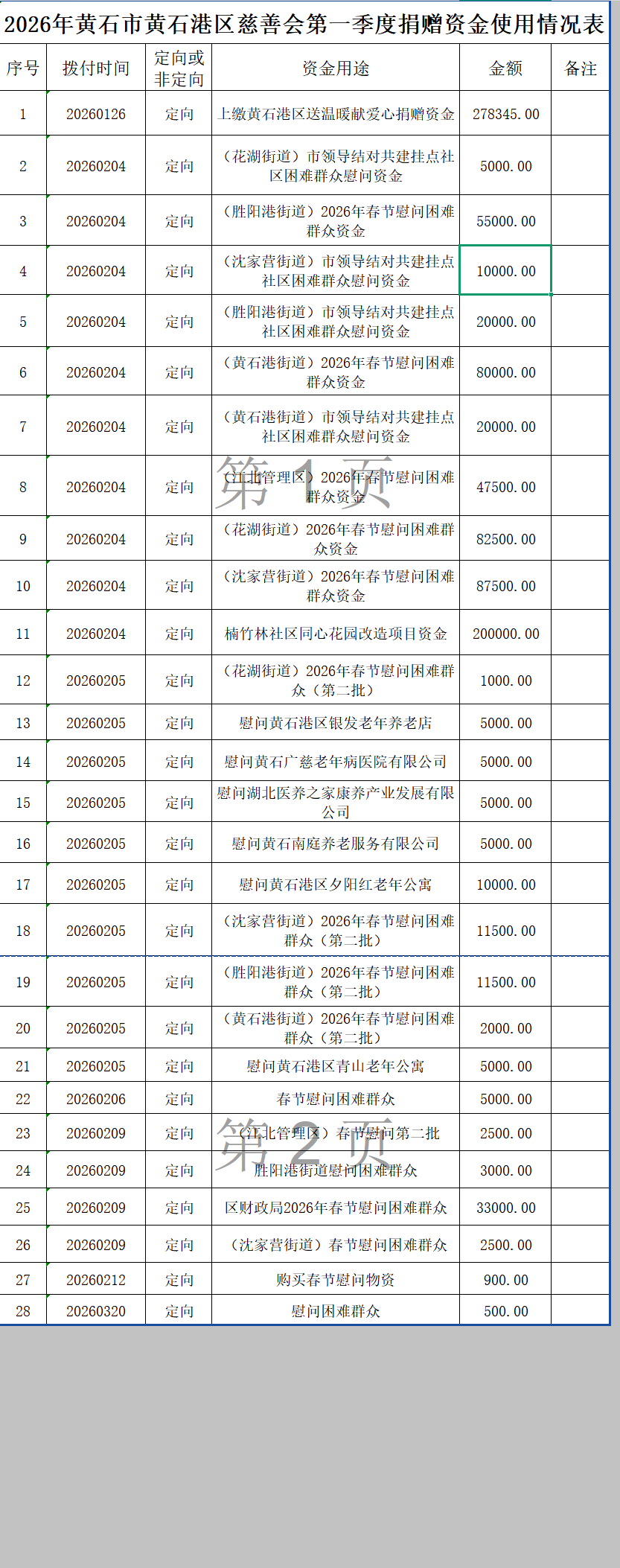 2026年黄石市黄石港区慈善会第一季度捐赠资金使用情况表