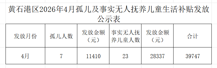 黄石港区2026年4月孤儿及事实无人抚养儿童生活补贴发放公示表