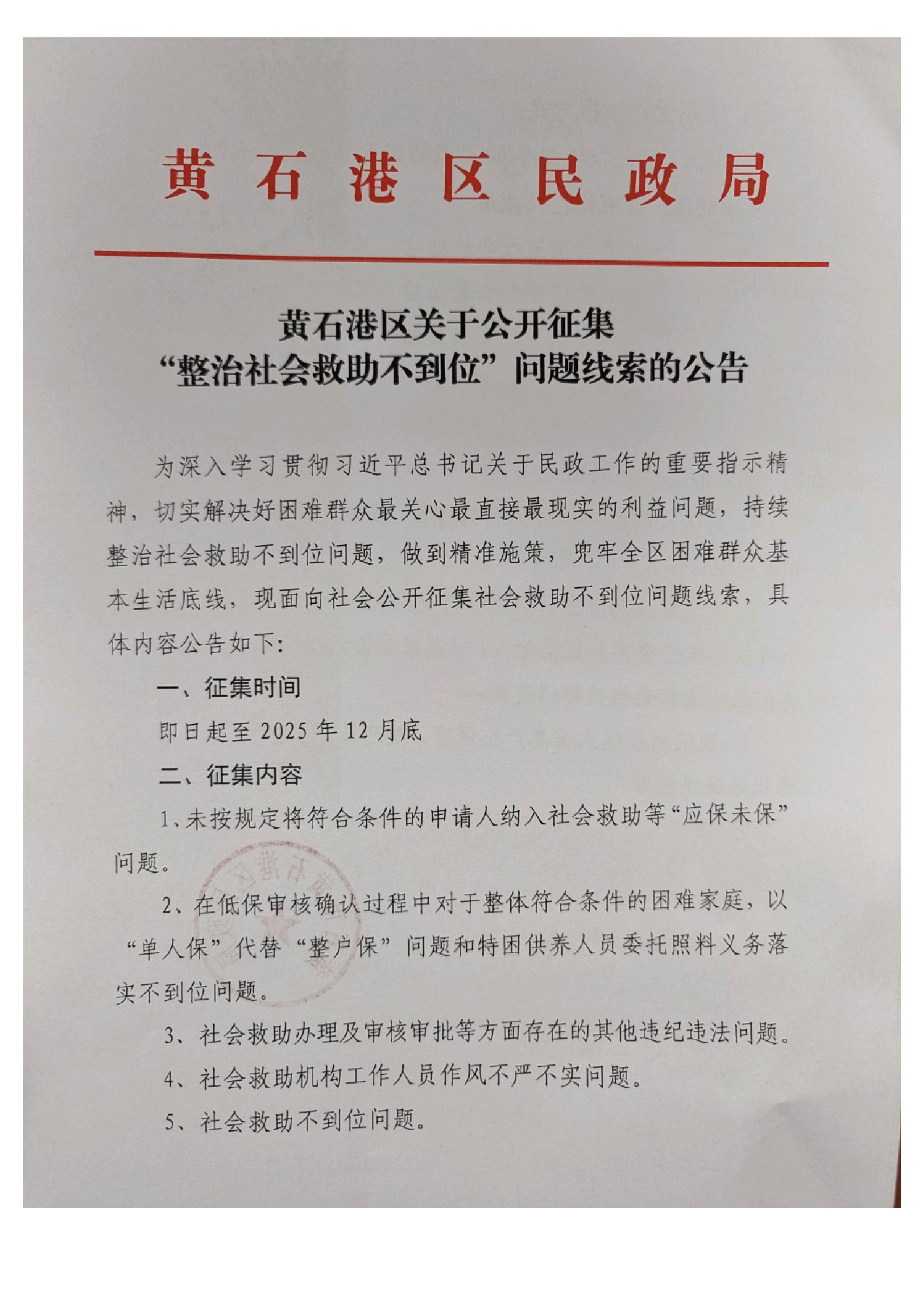 黄石港区关于公开征集“整治社会救助不到位”问题线索的公告