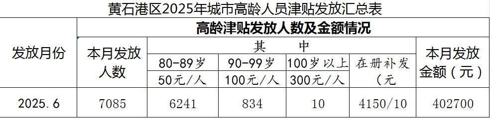 黄石港区2025年6月高龄津贴发放公示