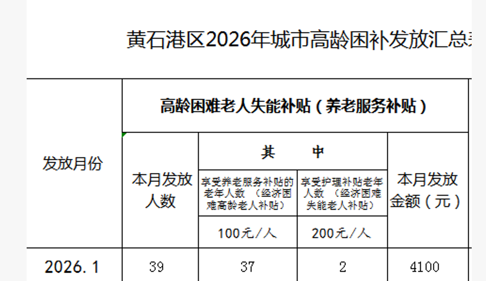 黄石港区2026年1月城市高龄困难老人失能补贴发放汇总表