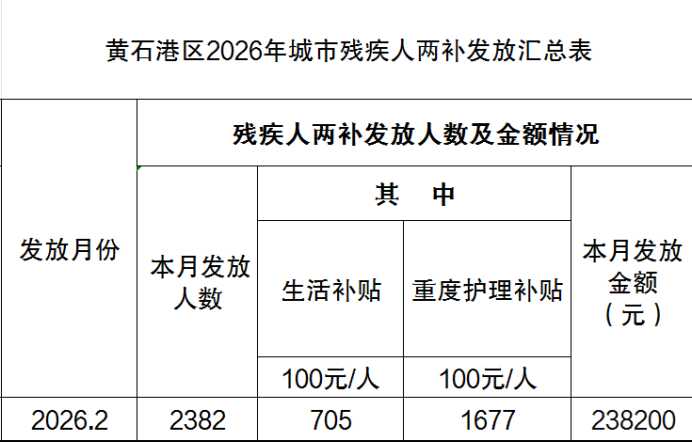 黄石港区2026年2月城市残疾人两补发放汇总表