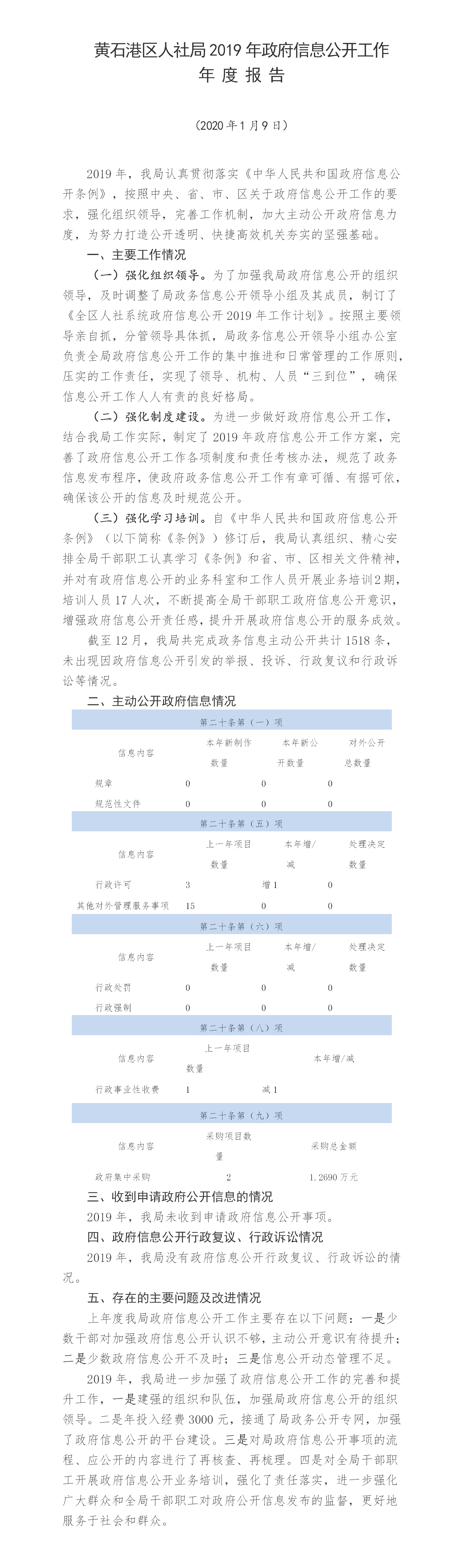 2019年黄石港区人力资源和社会保障局局政府信息公开工作年度报告