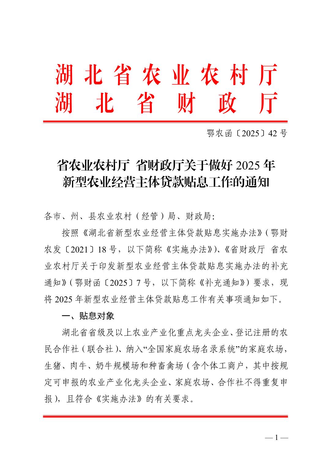 省农业农村厅省财政厅关于做好2025年 新型农业经营主体贷款贴息工作的通知