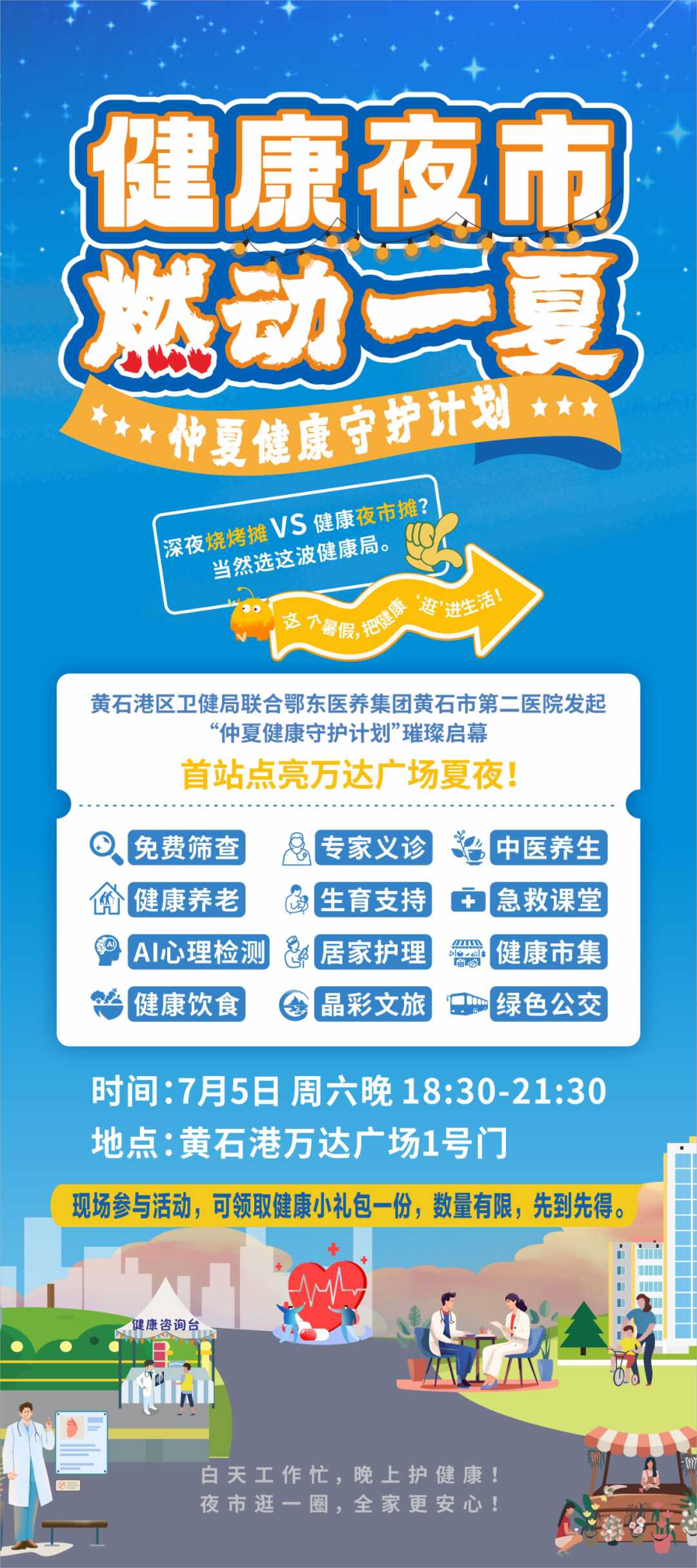 本次活动由区卫健局、区红十字会、区计生协联合黄石市第二医院共同发起。“健康夜市”开市时间为7月5日—8月30日,每周五或周六18:30—21:30,依次在黄石港区各大广场开市。
