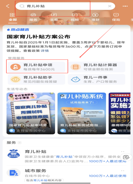 以支付宝申领为例,支付宝搜索育儿补贴,点击育儿补贴进入申领界面