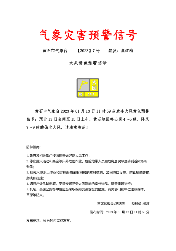 2023年1月13日11时59分发布大风黄色预警