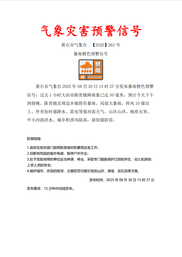 2025年08月30日15时27分发布暴雨橙色预警信号