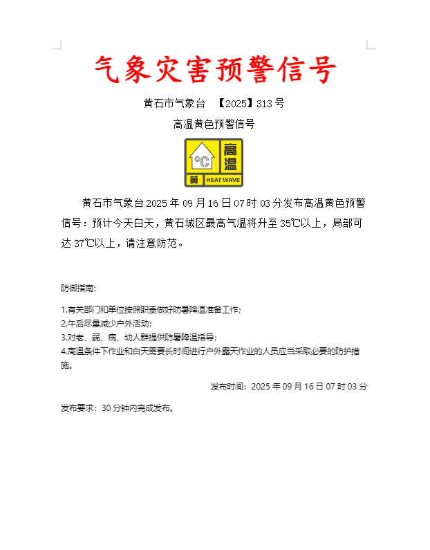 2025年09月16日07时03分发布高温黄色预警信号