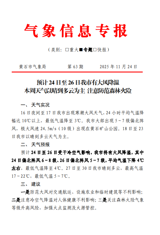 预计24日至26日我市有大风降温本周天气以晴到多云为主 注意防范森林火灾