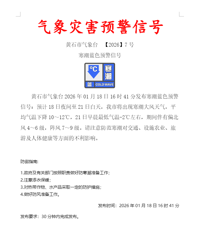 黄石市气象台2026年01月18日16时41分发布寒潮蓝色预警信号