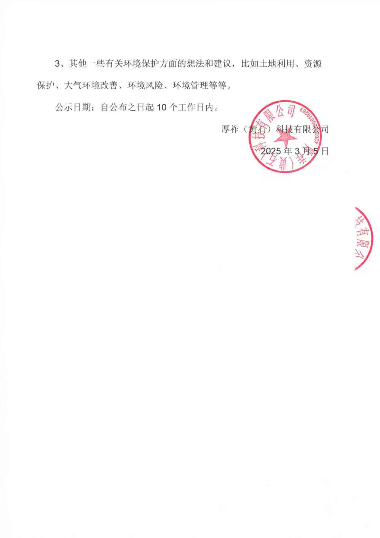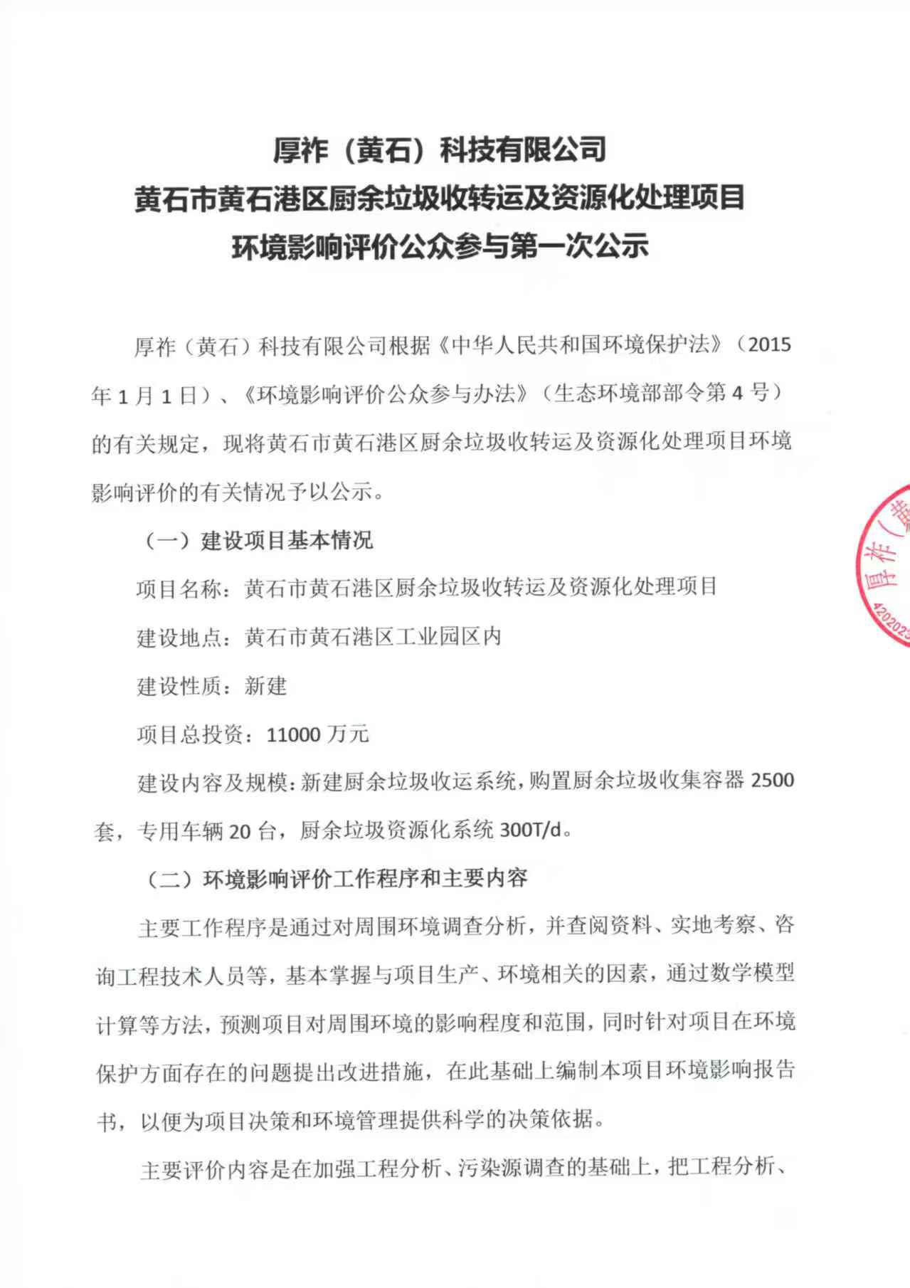 厚祚(黄石)科技有限公司黄石市黄石港区厨余垃圾收转运及资源化处理项目环境影响评价公众参与第一次公示