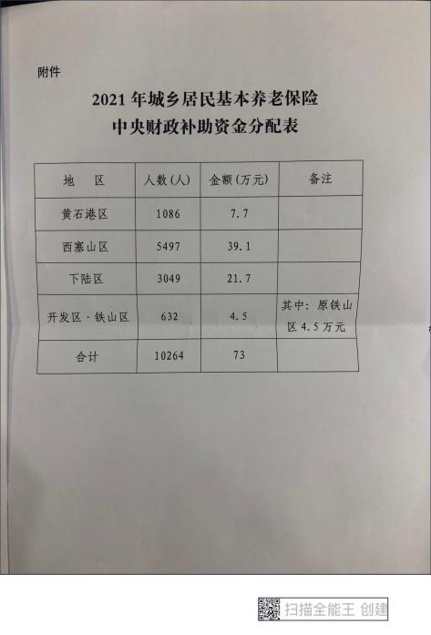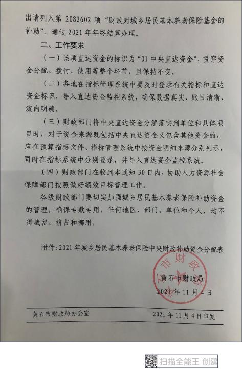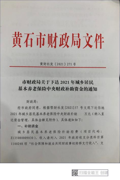 黄财社发【2021】271号市财政局关于下达2021年城乡居民基本养老保险中央财政补助资金的通知
